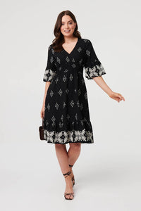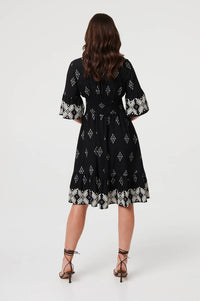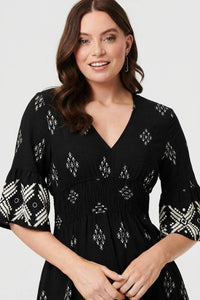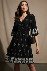 Discover effortless elegance with our black V-neck smock dress, featuring a vibrant geometric print, three-quarter flared sleeves, and a comfortable smocked waist. This knee-length design offers versatile style for any day-to-night occasion.