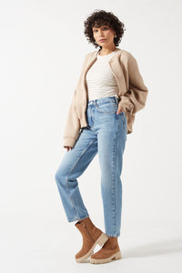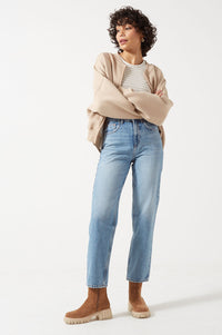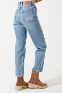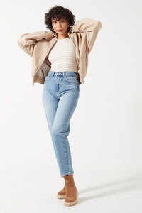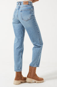 A mid-wash blue denim that features a high waist and straight leg in a timeless piece. Combined with a simple Tee and trainers, you'll have an all-time basic which with the addition of a blazer, trenchcoat or leather jacket and crossbody bag, will be updated into a cool outfit.