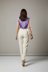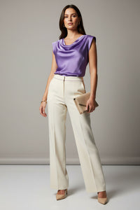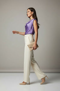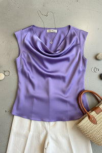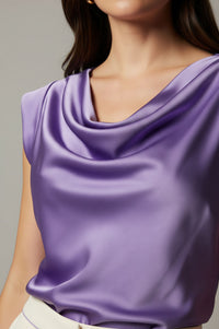 Elevate your style effortlessly with the Saint Maine Satin Cowl Neck Sleeveless Top, offering sophisticated fluidity and vibrant color. This Saint Maine top features a captivating draped cowl neckline, creating soft horizontal folds that beautifully frame the décolletage. Its sleek sleeveless design with wide-set shoulder seams ensures a clean, streamlined silhouette, perfectly complementing the vibrant purple hue. The straight hemline is neatly finished with a visible purple overlock stitch for a refined touch. Crafted from a luxurious satin-like fabric, this top offers a smooth, lustrous sheen and a wonderfully soft feel against your skin, ensuring comfort with elegance. Pair this versatile Satin Cowl Neck Sleeveless Top with tailored trousers for a polished office look or with a flowing skirt for an evening out. It transitions seamlessly from day to sophisticated night wear. Designed for a true-to-size fit, we recommend ordering your usual size for optimal drape and comfort.