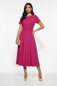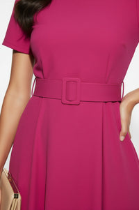 Embrace effortless sophistication in this Short-Sleeve Belted Midi Dress, designed to highlight your radiant style. Discover the flattering A-line silhouette of this vibrant magenta dress, featuring a classic crew neckline and comfortable short sleeves. The smooth bodice includes subtle bust darts, leading to a matching fabric-covered belt with a rectangular buckle at the center waist. Its midi hem gracefully flows, creating an elegant and refined profile. Crafted from a smooth matte fabric, this dress offers a comfortable feel with a subtle stretch, ensuring ease of movement throughout your day. Perfect for office wear, garden parties, or special luncheons, you can effortlessly pair this dress with nude heels and delicate jewelry for a polished ensemble. This Short-Sleeve Belted Midi Dress offers a true-to-size fit, designed to flatter your natural waistline.