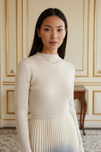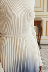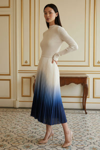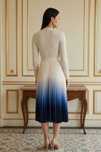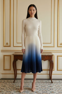 Midi dress featuring an off-white ribbed knit bodice with a mock neckline and long sleeves. The waist is cinched with a thin, self-fabric belt. The pleated skirt exhibits an ombre effect, transitioning from off-white at the waist to a deep blue at the hem.