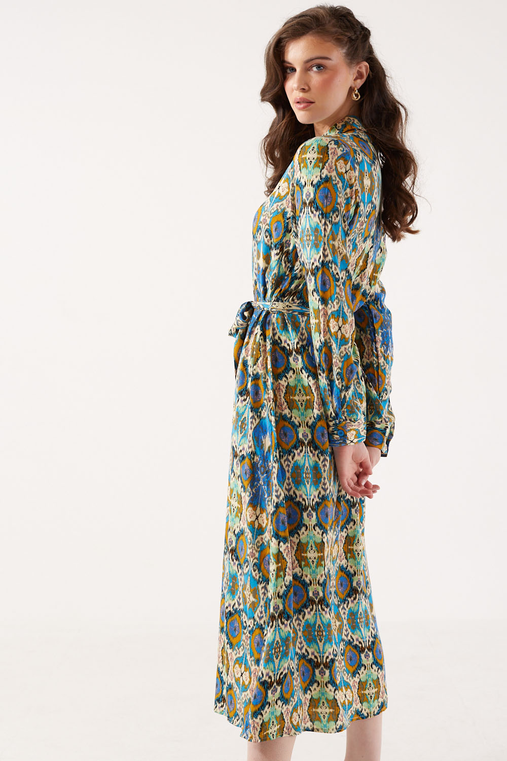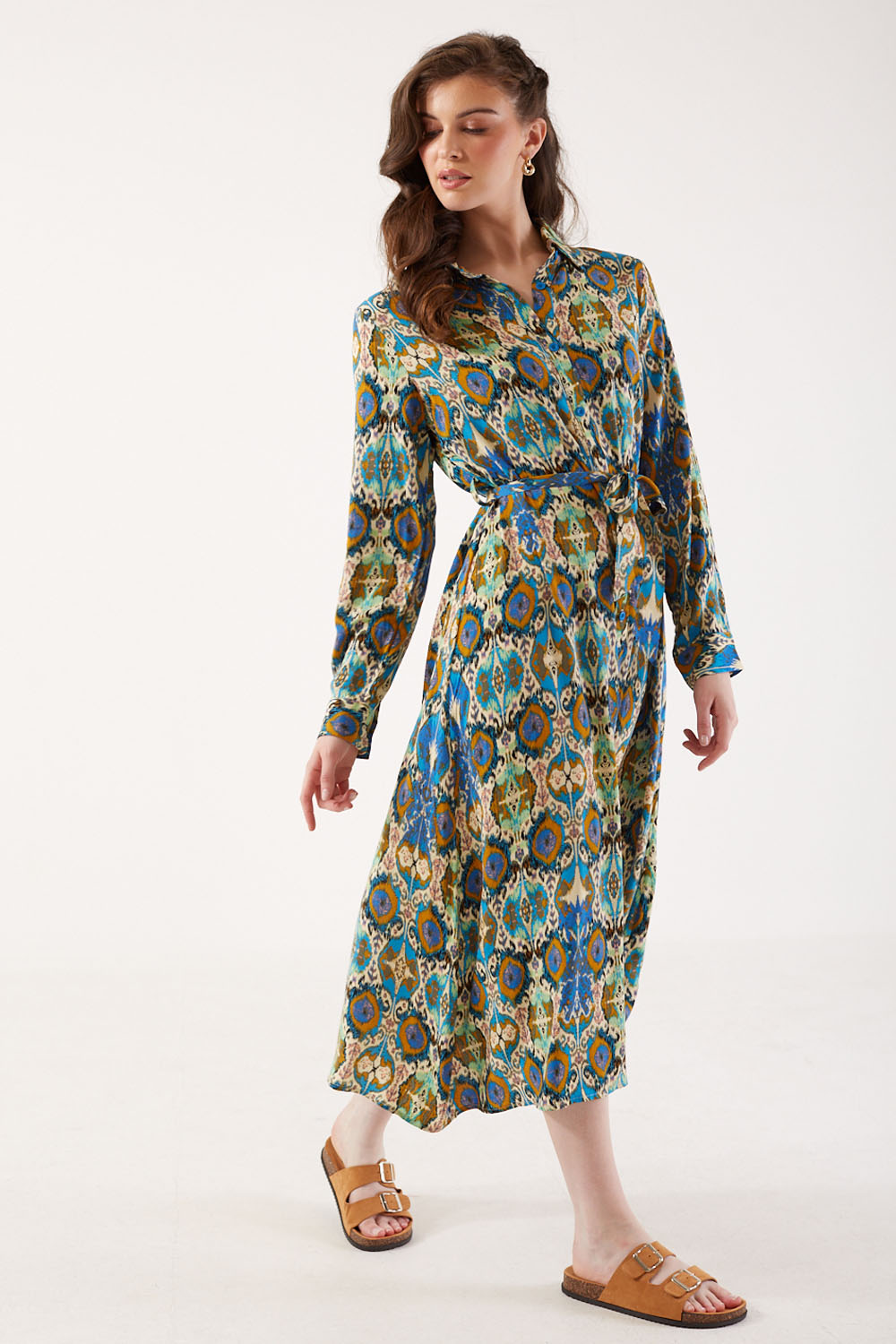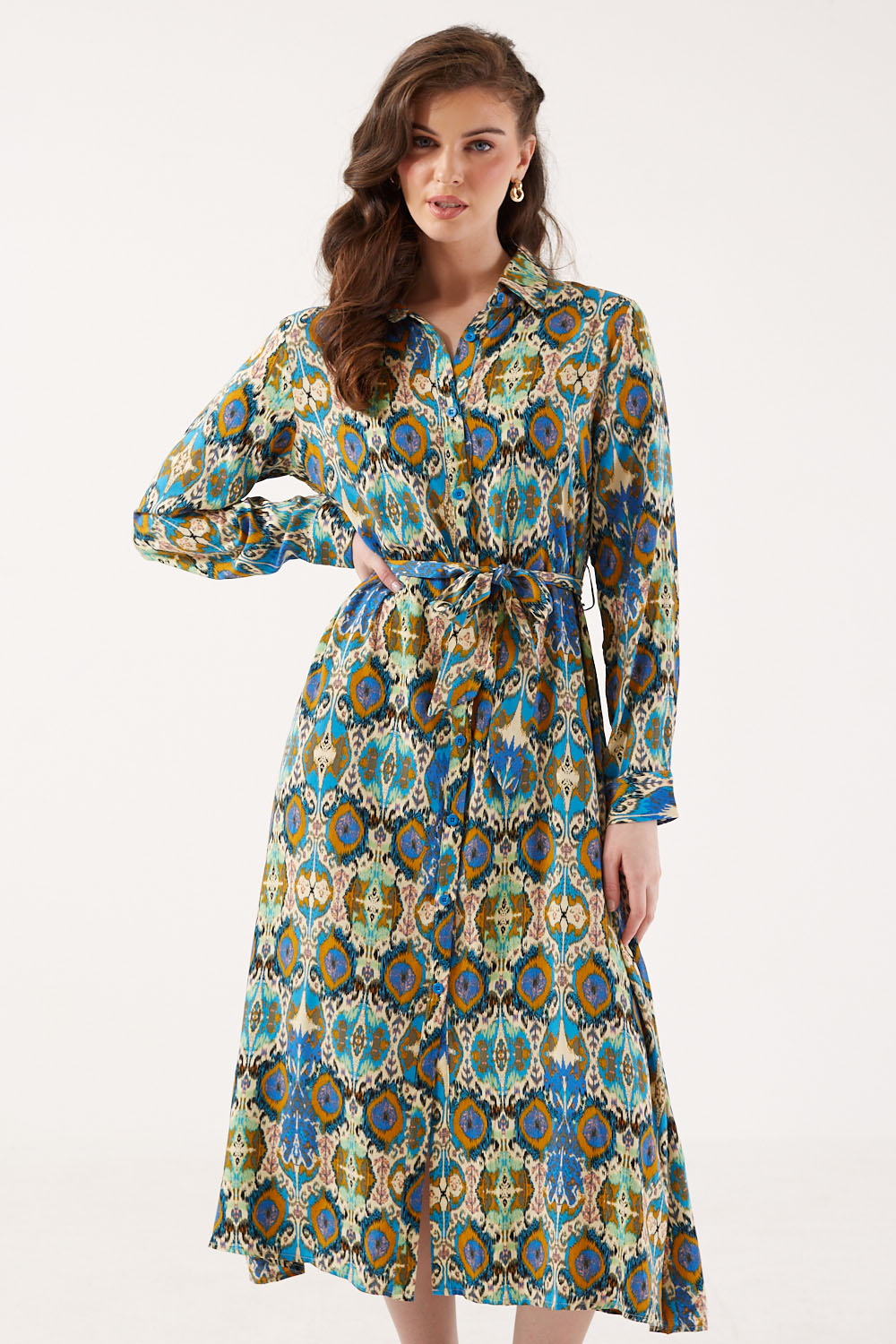 Enjoy timeless style with this Sammy Marc Angelo Shirt Dress. This midi-length dress features a self-fabric belt which allows adjusting it and a funky boho-like print. Made in viscose, it has a soft touch. Style it with sliders or sandals for a casual look. If you are looking for a cooler outfit, accessorize it with a black and gold belt, boots, and gold jewellery, keep the top buttons open and add a leather jacket or a fringed vest.