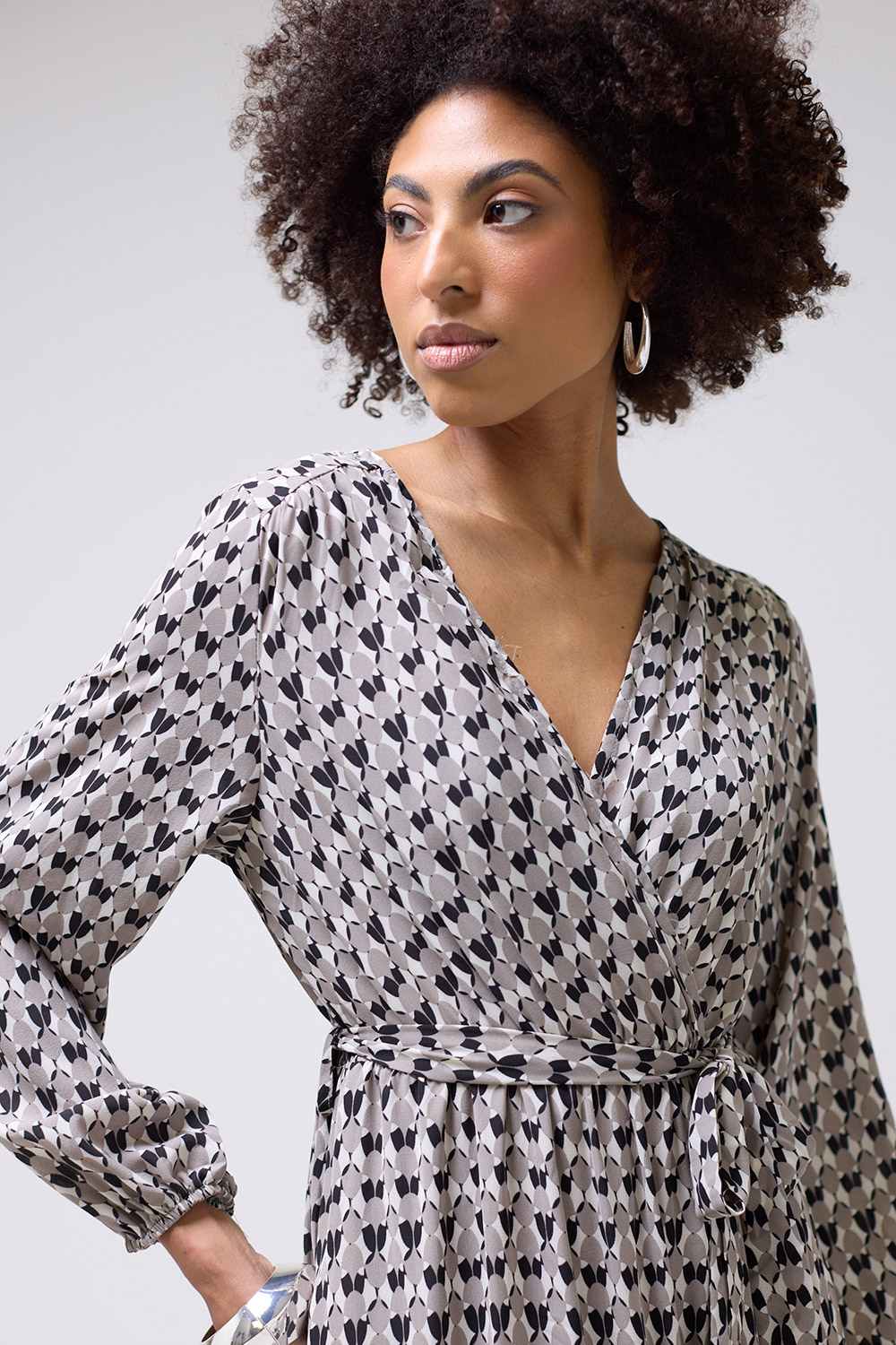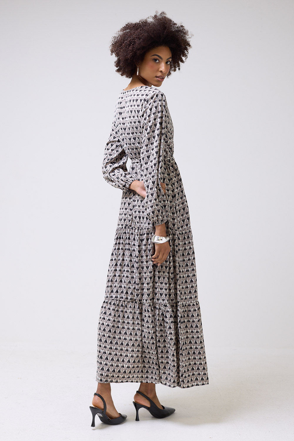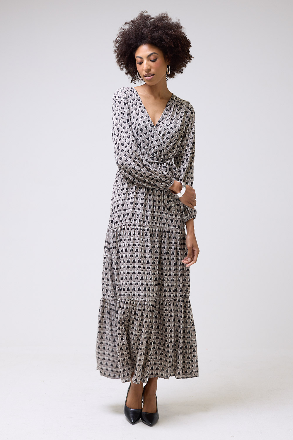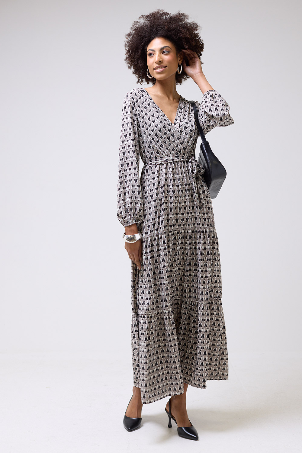 Ideal and versatile for the transitional season, the Zelia Maxi Dress features long elasticated sleeves, abstract print, a smock maxi skirt, a detachable self-tie belt to synch at the waist and create a flattering figure and a faux wrap V-neck. Style it with knee-high or ankle boots and add a trenchcoat to dress well for any occasion.